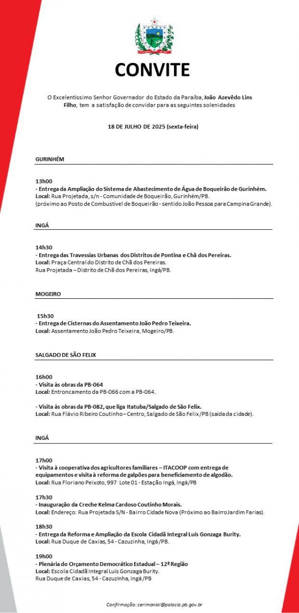 A agenda de visita e entrega de obras começa às 13h no município de Gurinhém, onde haverá a entrega da ampliação do sistema de abastecimento de água da comunidade Boqueirão de Gurinhém. Em seguida, às 14h30, entrega as travessias urbanas dos distritos de Pontina e Chã dos Pereiras, pertencentes ao município de Ingá.