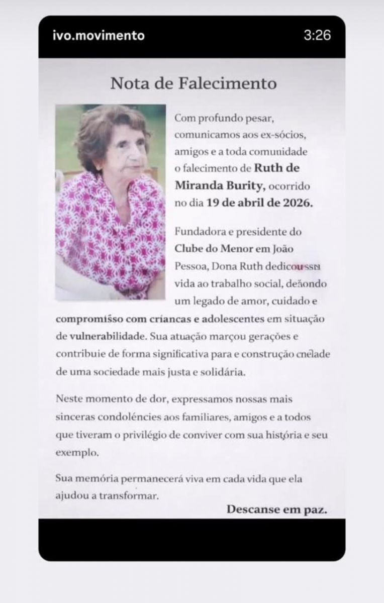 Irmã mais velha do ex-governador Tarcísio Burity e do ex-prefeito de Ingá, Antônio Burity, ambos também já falecidos, Dona Ruth faleceu na tarde de ontem (domingo, 19), após alguns dias hospitalizadas. Ela tinha 102 anos e era tia do ex-prefeito de Ingá, Robério Burity, que a acompanhava permanentemente.