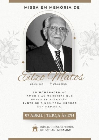 A Missa de 7º Dia de falecimento do escritor, professor, jurista e ex-deputado Eilzo Matos, será realizada amanhã, dia 7 de abril, às 17horas, na Igreja Nossa Senhora de Fátima, em Miramar. “Homenagem ao amor e às memórias que nunca se apagarão. Junte-se a nós para honrar sua memória”, diz o texto da mensagem no convite que a família do saudoso parlamentar expediu para os amigos e admiradores.
