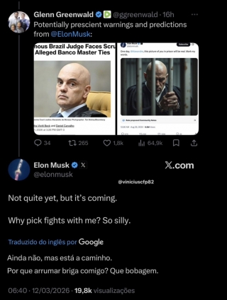 Glenn Greenwald destacou o comentário do bilionário ao compartilhar a interação com seus seguidores, afirmando tratar-se de “possíveis previsões ou alertas de Elon Musk”.